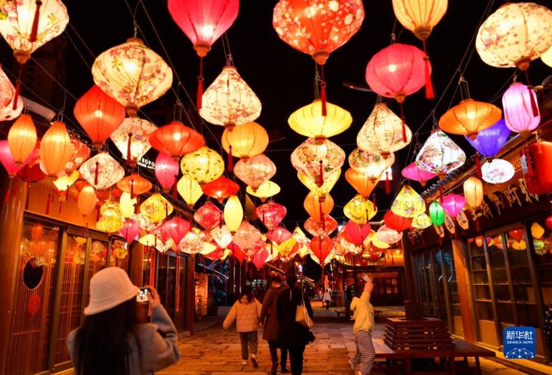 1月17日晚,人們?cè)诤笔⌒骺h城興隆老街觀看兔元素彩燈。