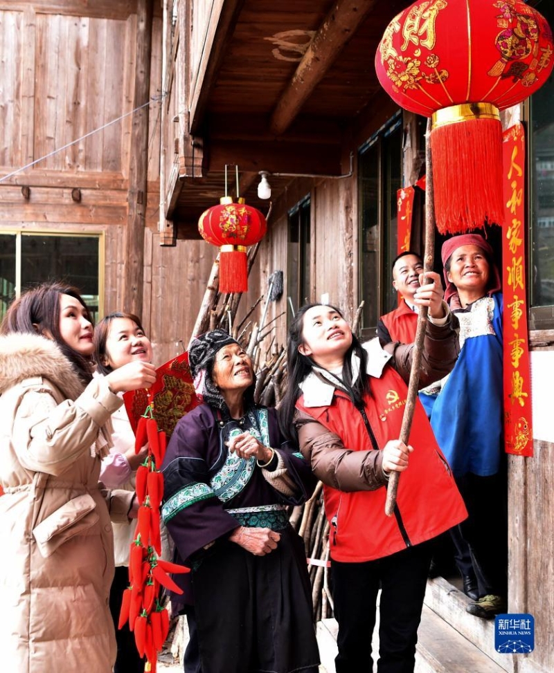 1月17日,貴州省榕江縣崇義鄉(xiāng)村干部和黨員志愿者在下咸村給獨(dú)居老人掛燈籠。