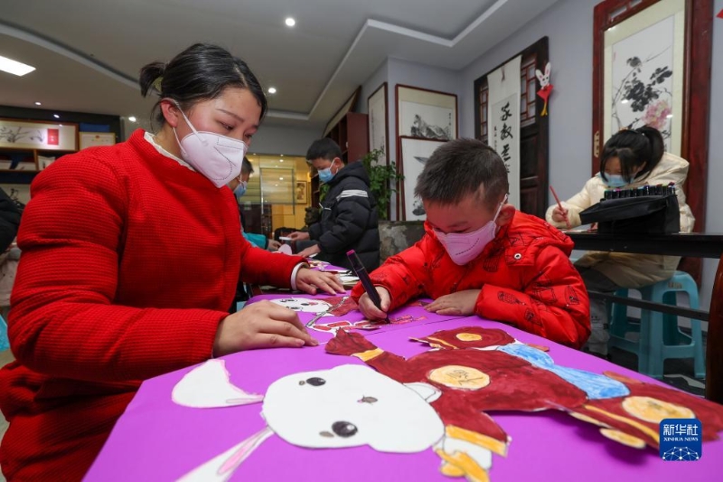 1月17日,貴州省畢節(jié)市七星關(guān)區(qū)青云書(shū)畫(huà)院老師指導(dǎo)小朋友繪制兔年主題畫(huà)。