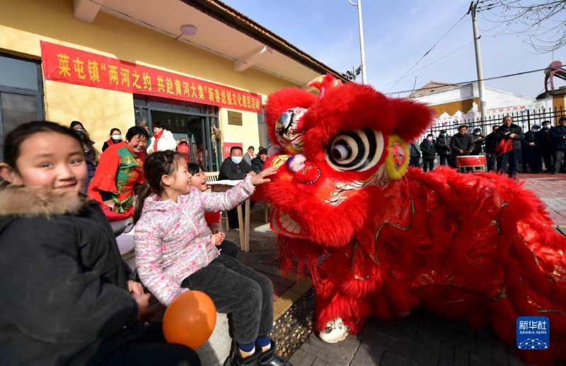 1月17日,在山東省聊城市茌平區(qū)菜屯鎮(zhèn)鳳凰新村,小朋友同舞獅表演進(jìn)行互動(dòng)嬉戲。