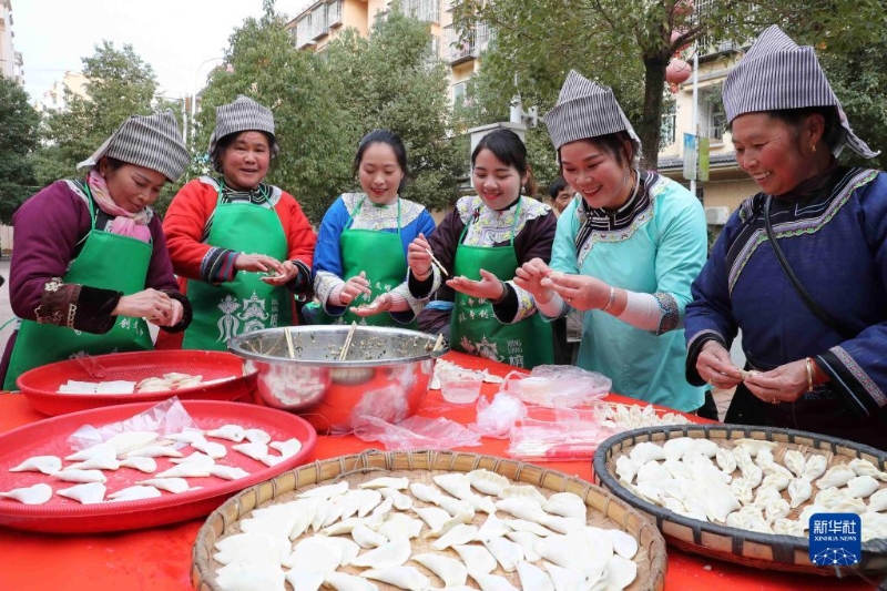 1月17日,群眾在貴州省黔東南苗族侗族自治州榕江縣車民街道富民移民安置區(qū)迎新年活動(dòng)中包餃子。