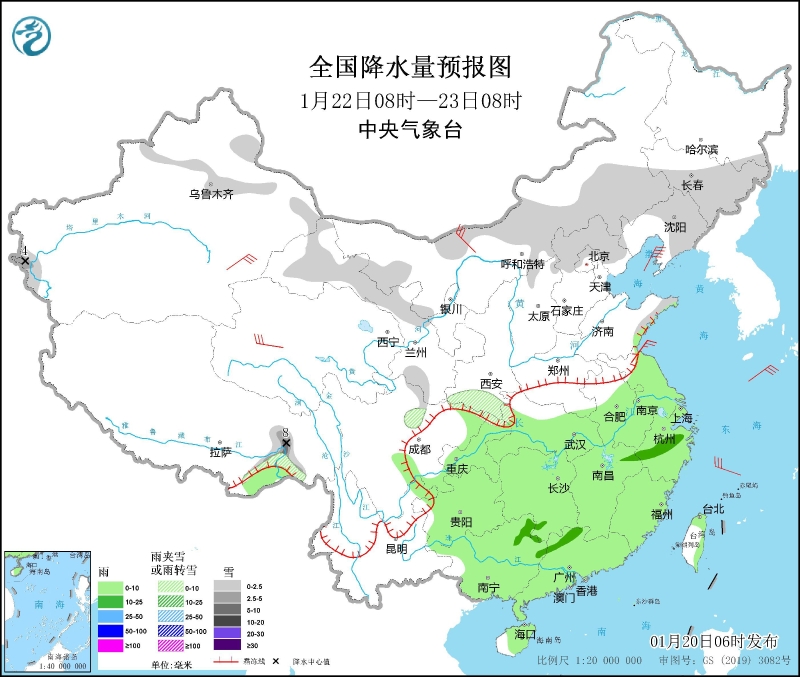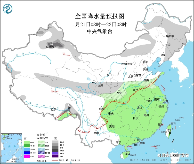 1月20日08時(shí)至21日08時(shí),新疆北部和南疆盆地、內(nèi)蒙古中東部、黑龍江西部北部和南部、吉林東北部、西藏西北部和東南部、青海南部、甘肅南部、陜西西南部、四川盆地西北部等地部分地區(qū)有小到中雪或雨夾雪,其中,西藏西部局地有暴雪。西南地區(qū)東南部、云南東南部、廣東東南部、福建南部和海南島中東部等地部分地區(qū)有小到中雨,其中,臺(tái)灣島北部和東部等地局地有大雨(25~45毫米)。新疆沿天山地區(qū)、西藏北部、內(nèi)蒙古中西部等地部分地區(qū)有5~6級(jí)風(fēng),渤海、黃海、東海、臺(tái)灣海峽、南海大部海域?qū)⒂?~7級(jí)、陣風(fēng)8~9級(jí)的偏北或東北風(fēng)(見(jiàn)圖1)。