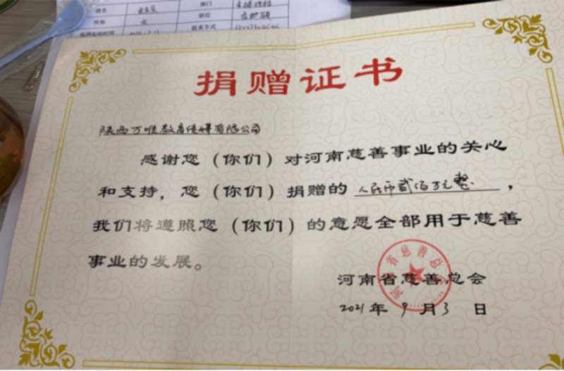 (圖為2021年萬唯為鄭州抗洪救災(zāi)捐贈200萬元)