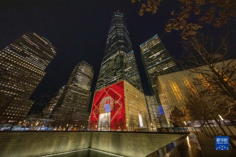 1月20日,美國(guó)紐約世貿(mào)中心一號(hào)樓亮起中國(guó)春節(jié)主題燈光。