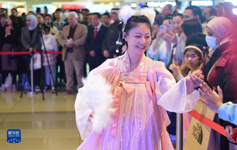 1月20日,在科威特費(fèi)爾瓦尼耶省舉行的迎接中國(guó)農(nóng)歷春節(jié)活動(dòng)上,一名女子展示中國(guó)傳統(tǒng)服飾。