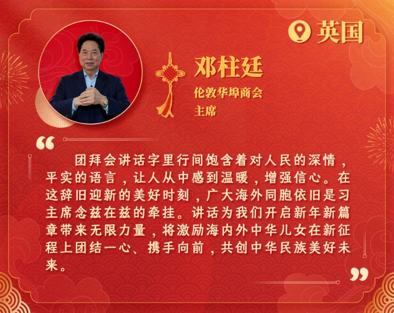 新春佳節(jié)到來之際,我駐外人員、華僑華人和留學生聆聽了習近平總書記在春節(jié)團拜會上的講話,深感溫暖與振奮,紛紛表示將積極響應(yīng)習近平總書記的號召,在充滿光榮和夢想的新征程上腳踏實地,埋頭苦干,接續(xù)奮斗,創(chuàng)造更加美好的未來。