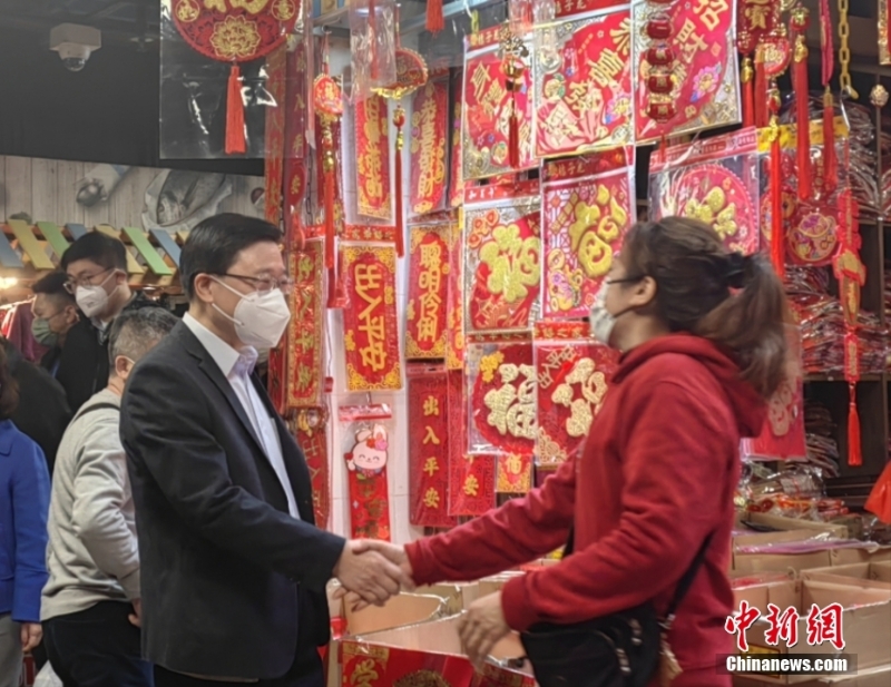 1月20日,香港特區(qū)行政長官李家超來到新界葵青區(qū)長亨邨探訪獨居長者。其間行經(jīng)當(dāng)?shù)亟质?,在一個“揮春”(春聯(lián))攤位旁駐足,與商戶交流。 中新社記者 劉大煒 攝