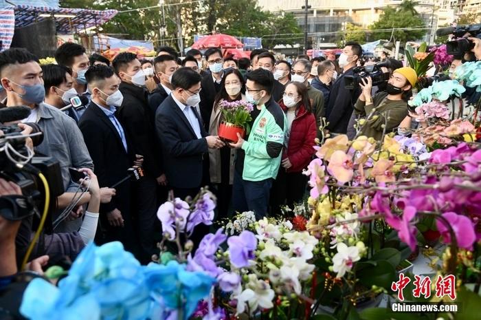 1月20日為農(nóng)歷臘月二十九,香港特區(qū)行政長官李家超來到維多利亞公園逛年宵花市,受到現(xiàn)場市民歡迎并合照留念。 中新社記者 李志華 攝