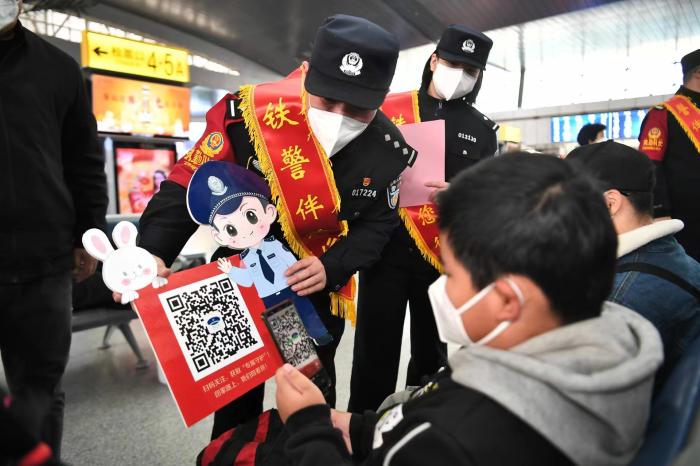 在天津站候車室,執(zhí)勤民警變身“平安使者”,邀請旅客關(guān)注“鐵路公安”微信公眾號,在這里能看最好看的鐵警故事;送上“平安年貨”,宣傳防范電信詐騙知識,提示安全文明乘車出行注意事項;裝扮“平安春節(jié)”,卡通版的鐵警形象搭配粉粉的生肖兔,為旅客出行增添一抹溫馨;做出“平安承諾”,“回家路上,我們陪著你!”津鐵公安用節(jié)日堅守兌現(xiàn)莊嚴(yán)承諾。