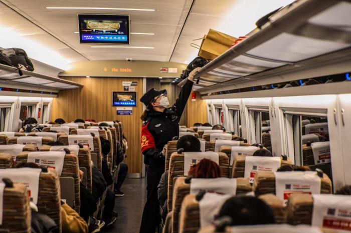 高鐵列車滿載團(tuán)圓期盼開往家的方向。京滬高鐵青年女警包乘組的一名女乘警正在巡視車廂。我們看不清她的容顏,卻能從堅毅挺拔的身姿感受到青春向上的氣勢,醒目的警察袖標(biāo)就像一顆跳動的“小紅心”。春節(jié)回家攜帶年貨,行李架上的硬質(zhì)包裝物品多了起來,但如果碼放不整齊,列車晃動就容易掉落砸傷旅客。乘警巡視車廂時會特別留意行李架,幫助旅客整理行李,舉起的是手臂,托起的是愛心。