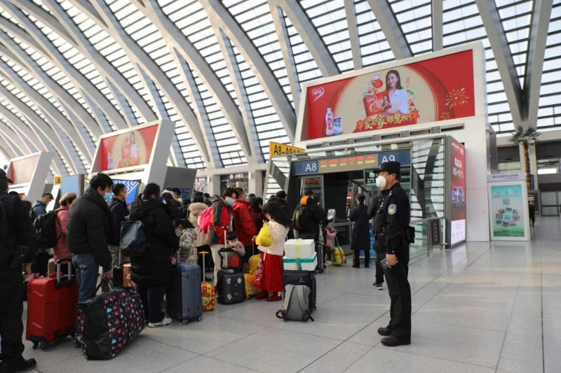 在車站檢票口,候車旅客提前排起長隊,等待閘機開啟后驗票乘車。執(zhí)勤民警到達(dá)現(xiàn)場維持秩序,組織老人、孩子、攜帶大件行李的旅客在人工口有序排隊,在旅客身邊撐起一把高高的“安全傘”,用心用情守護(hù)旅客帶愛回家。(文/史超 圖/王秋蕓)