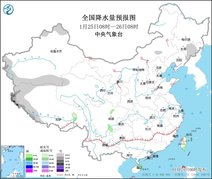 1月25日08時(shí)至26日08時(shí),吉林中東部、新疆北疆北部、南疆南部和西部山區(qū)、西藏西部、青海西北部等地部分地區(qū)有小到中雪,其中,西藏西南部局地有大到暴雪(10~18毫米)。四川盆地西部、云南東北部、海南島東北部、臺(tái)灣島東部和南部等地部分地區(qū)有小雨。西北地區(qū)東北部、內(nèi)蒙古大部、遼東半島、河北北部、山東半島等地部分地區(qū)有4~6級(jí)風(fēng),局地陣風(fēng)7~8級(jí)。東海南部、臺(tái)灣海峽、臺(tái)灣以東洋面、巴士海峽、南海大部海域?qū)⑾群笥?~8級(jí)、陣風(fēng)10~11級(jí)的大風(fēng)。