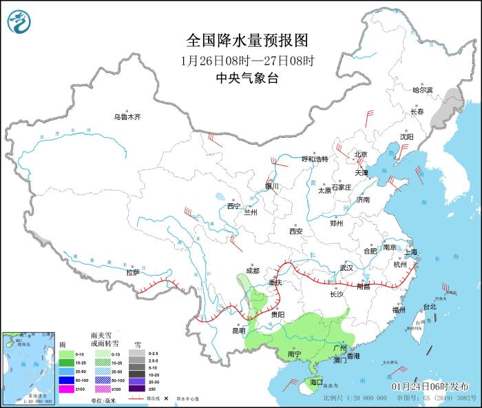 1月26日08時(shí)至27日08時(shí),黑龍江東南部、吉林東部、四川東南部等地部分地區(qū)有小雪或雨夾雪。云南東部、廣西、廣東中西部、海南島中東部等地部分地區(qū)有小雨。西北地區(qū)東北部、內(nèi)蒙古大部、河北北部、遼東半島、天津、山東半島、浙江東北部等地部分地區(qū)有4~6級(jí)風(fēng)。渤海、渤海海峽、黃海大部、東海大部、南海大部海域?qū)⒂?~7級(jí)、陣風(fēng)8級(jí)的大風(fēng)。