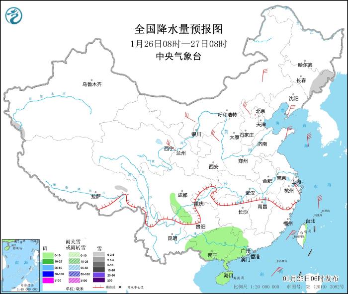 1月26日08時至27日08時,吉林東部等地部分地區(qū)有小雪;華南中西部、四川盆地西南部、臺灣島東部等地部分地區(qū)有小雨。內(nèi)蒙古、青海東部、西北地區(qū)東部、華北北部、遼東半島、山東半島、浙江東部等地部分地區(qū)有5~6級風;渤海、渤海海峽、黃海大部、臺灣海峽、南海大部、北部灣有6~7級、陣風8級風,東海大部有7~8級、陣風9級風。