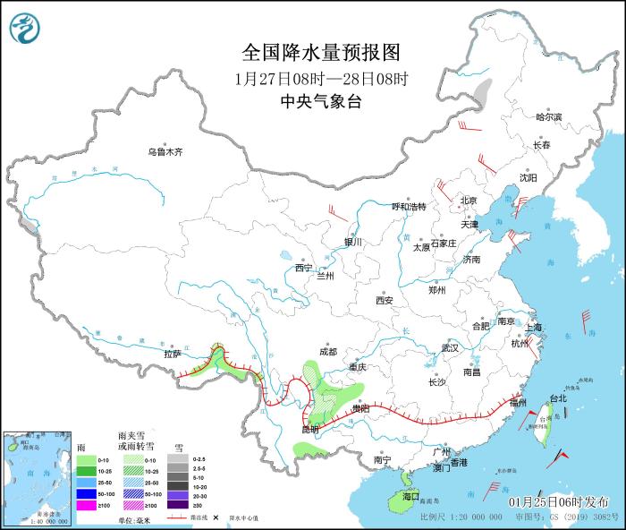 1月25日08時至26日08時,吉林東部、新疆南疆西部山區(qū)、西藏西部等地部分地區(qū)有小到中雪,其中,西藏西部等地部分地區(qū)有大雪或暴雪(10~16毫米);四川盆地西部、云南東北部、海南島東部、臺灣島東部等地部分地區(qū)有小雨。內(nèi)蒙古中西部、遼東半島、山東半島、青海東部、河北北部等地部分地區(qū)有4~6級風;臺灣海峽、臺灣以東洋面、巴士海峽、南海大部將有6~8級、陣風9級的大風,其中臺灣海峽、巴士海峽、南海東北部和西南部的部分海域風力可達9級、陣風10~11級。
