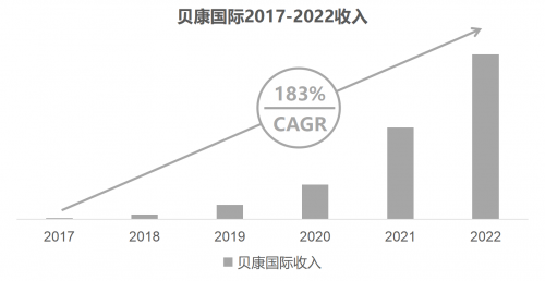 在經(jīng)歷了疫情的重大考驗(yàn)下,貝康國(guó)際依舊保持高速增長(zhǎng),并在2022年取得了優(yōu)異的成績(jī),銷(xiāo)售業(yè)績(jī)達(dá)6億元人民幣。收入在2022年同比2021年增長(zhǎng)達(dá)80%,表現(xiàn)令人驚艷。自2017年成立以來(lái), 經(jīng)歷了三年的疫情反復(fù)和市場(chǎng)競(jìng)爭(zhēng)的挑戰(zhàn),2017年-2022年的年復(fù)合增長(zhǎng)率高達(dá)183%,遠(yuǎn)超行業(yè)平均增長(zhǎng)水平。