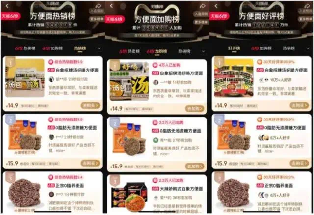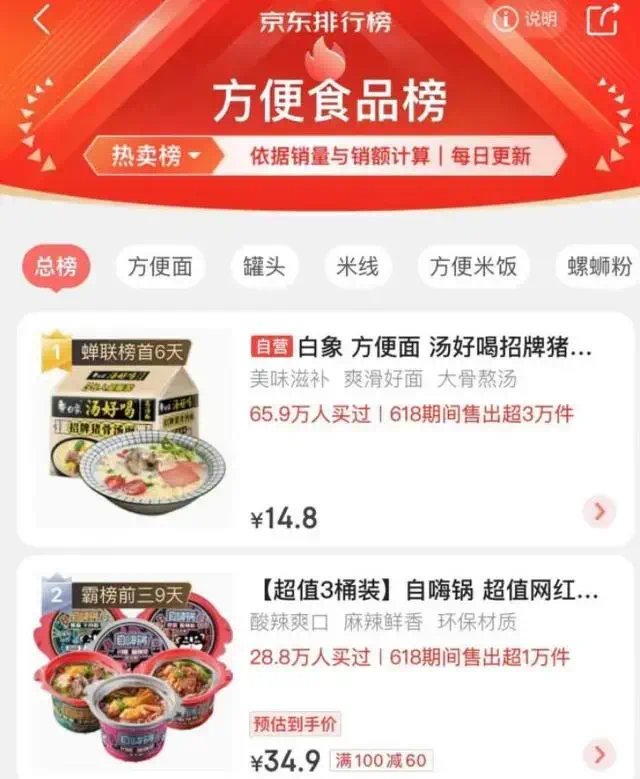 2022年618期間,白象湯好喝就持續(xù)在京東、天貓兩大平臺熱銷,并多次登頂京東方便食品熱賣榜和天貓方便面熱銷榜。