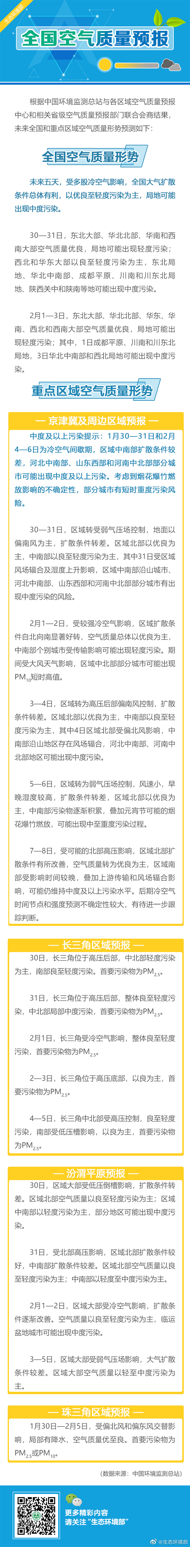 中新網(wǎng)1月29日電 據(jù)生態(tài)環(huán)境部官方微博消息,未來(lái)五天(1月30日—2月3日),受多股冷空氣影響,全國(guó)大氣擴(kuò)散條件總體有利,以優(yōu)良至輕度污染為主,局地可能出現(xiàn)中度污染。