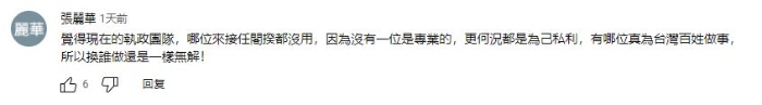 不少網(wǎng)友留言批評(píng):“他的心里只有高端沒(méi)有人民”“不祈望就沒(méi)失望”“無(wú)需期待”“覺(jué)得現(xiàn)在的執(zhí)政團(tuán)隊(duì),哪位來(lái)接任都沒(méi)用,因?yàn)闆](méi)有一位是專(zhuān)業(yè)的,更何況都是為己私利,有哪位真為臺(tái)灣百姓做事,所以換誰(shuí)做還是一樣無(wú)解?!?/p>