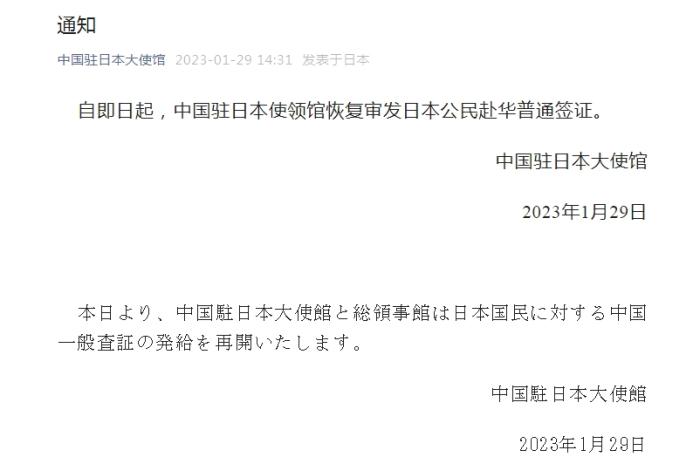 中新網(wǎng)1月29日電 據(jù)中國(guó)駐日本大使館微信公眾號(hào)29日消息,自即日起,中國(guó)駐日本使領(lǐng)館恢復(fù)審發(fā)日本公民赴華普通簽證。