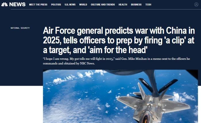 中新網(wǎng)1月30日電(甘甜)“我的直覺告訴我,美國將在2025年與中國開戰(zhàn)。做好準備?!比涨?,美國四星上將、空軍機動司令部司令邁克·米尼漢(Mike Minihan)向下屬軍官發(fā)送了一份備忘錄,并作出上述大膽預測。
