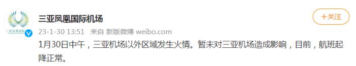 中新網(wǎng)1月30日電 據(jù)三亞鳳凰國(guó)際機(jī)場(chǎng)有限責(zé)任公司官方微博消息,1月30日中午,三亞機(jī)場(chǎng)以外區(qū)域發(fā)生火情。暫未對(duì)三亞機(jī)場(chǎng)造成影響,目前,航班起降正常。