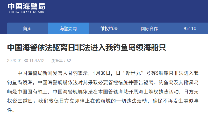 中國(guó)海警局新聞發(fā)言人甘羽表示,1月30日,日“新世丸”號(hào)等5艘船只非法進(jìn)入我釣魚(yú)島領(lǐng)海,中國(guó)海警艦艇依法對(duì)其采取必要管控措施并警告驅(qū)離。釣魚(yú)島及其附屬島嶼是中國(guó)固有領(lǐng)土,中國(guó)海警艦艇依法在本國(guó)管轄海域開(kāi)展海上維權(quán)執(zhí)法活動(dòng),日方無(wú)權(quán)說(shuō)三道四。我們敦促日方立即停止在該海域的一切違法活動(dòng),確保不再發(fā)生類似事件。
