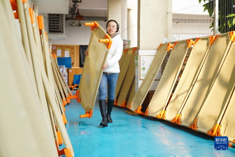 1月31日,在重慶市北碚區(qū)一家幼兒園,一名教師在晾曬孩子們的寢具。