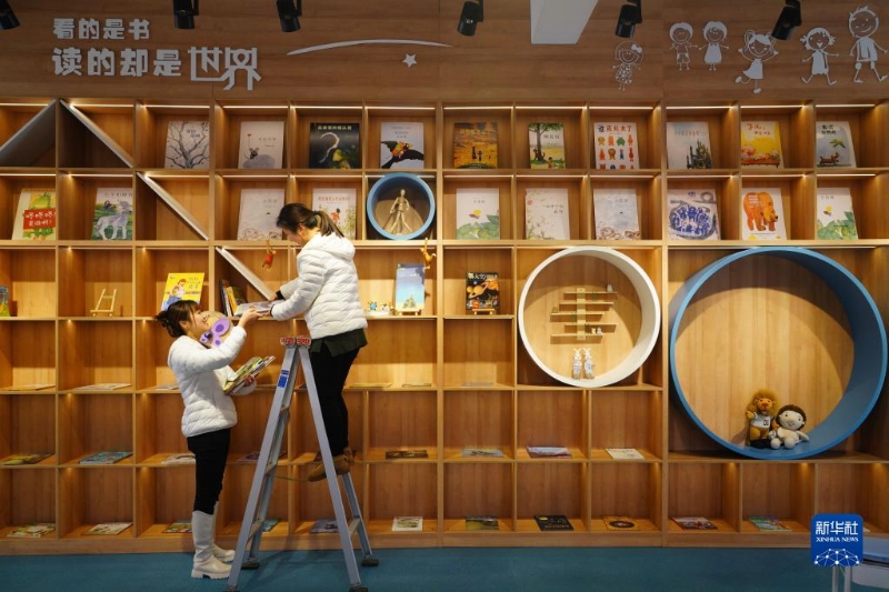 1月31日,在重慶市北碚區(qū)一家幼兒園,兩名教師在整理校園讀書角。