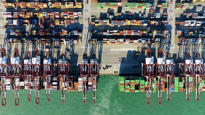 1月27日,集裝箱貨輪在青島港前灣集裝箱碼頭裝卸貨物(無人機(jī)照片)。新華社記者 李紫恒 攝
