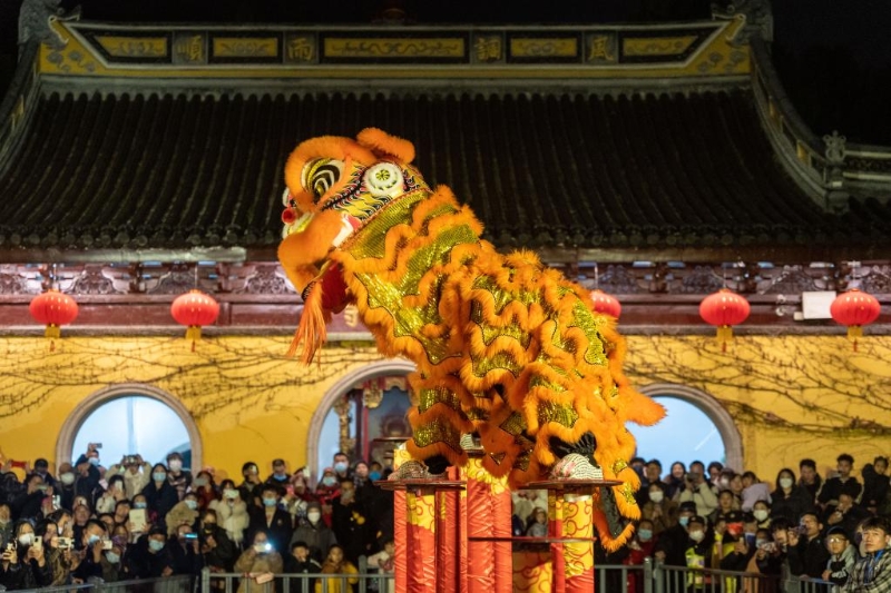 游客在江蘇省無(wú)錫惠山古鎮(zhèn)景區(qū)觀看舞獅表演(1月22日攝)。新華社發(fā)