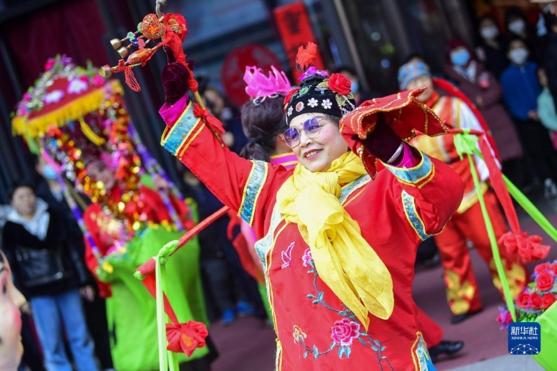 2月5日,演員在手造年貨大集上表演山東大秧歌。