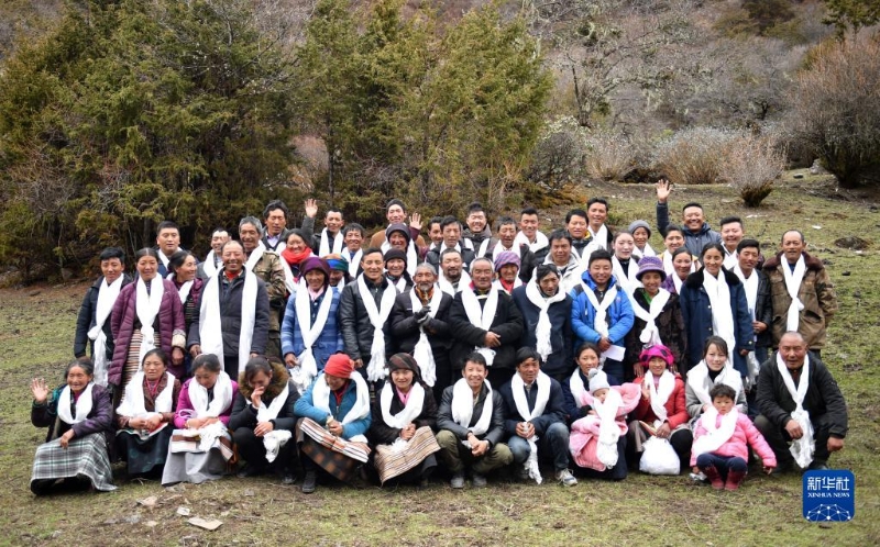 新遷入玉麥鄉(xiāng)的居民代表與卓嘎、央宗等合影(2019年4月9日攝)。新華社記者 晉美多吉 攝