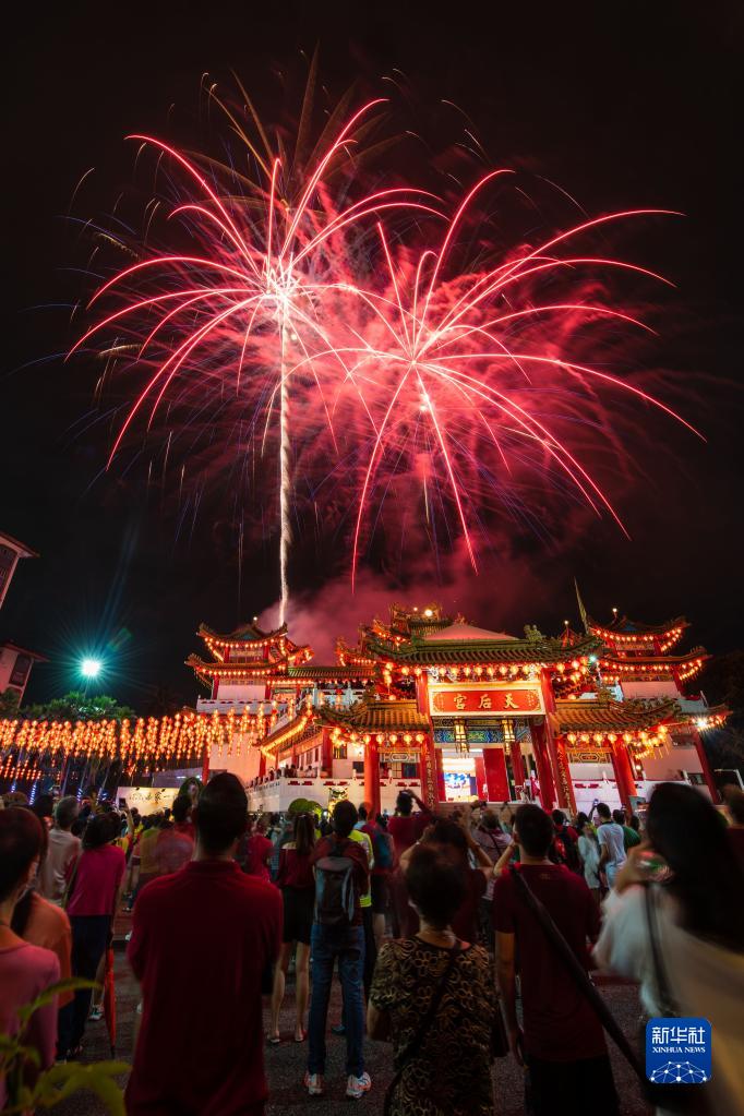 2月5日,民眾在馬來西亞吉隆坡天后宮觀賞煙花。