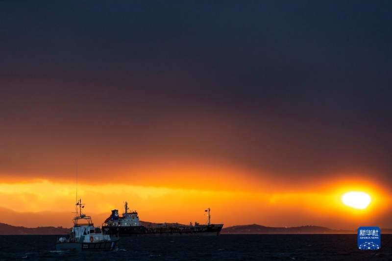 這是2月4日在希臘雅典西部的埃萊夫西斯拍攝的落日景象。