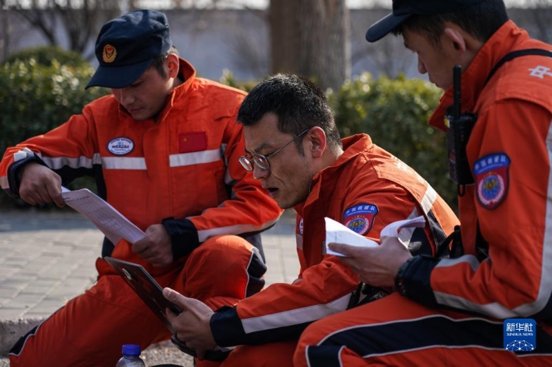 2月7日,中國救援隊隊員在北京大興消防訓練基地核對設備清單。
