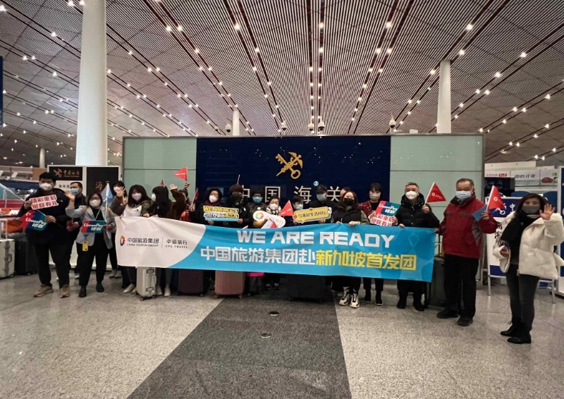 2月6日,參加“中國旅游集團赴新加坡首發(fā)團”的游客在出發(fā)前合影留念。(受訪者供圖)