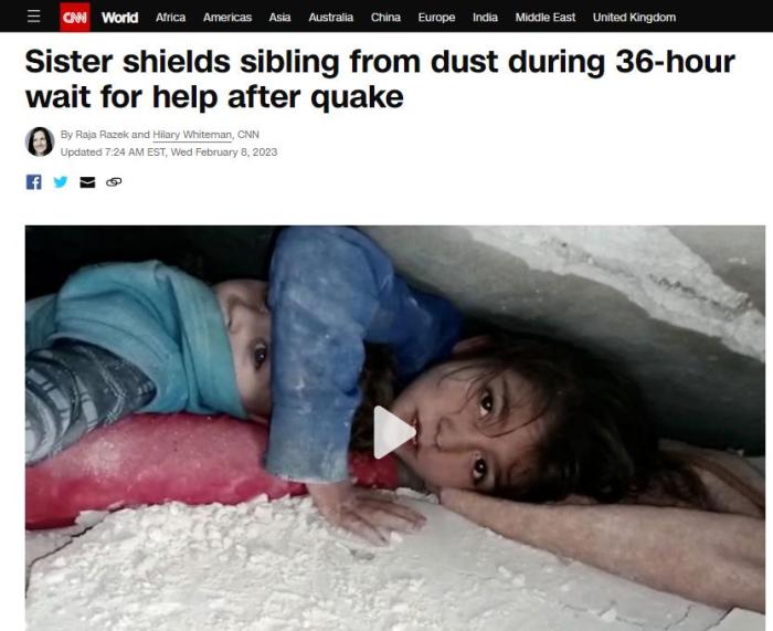 敘利亞西北部伊德利卜省一個村落遭遇強(qiáng)震后,一對年幼姐弟在廢墟中受困超過36小時(shí)后終于獲救。搜救人員發(fā)現(xiàn)被夾在巨大水泥板中間的姐弟時(shí),姐姐正舉起小小的手臂,保護(hù)著弟弟頭部。