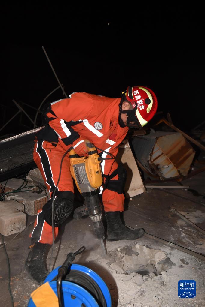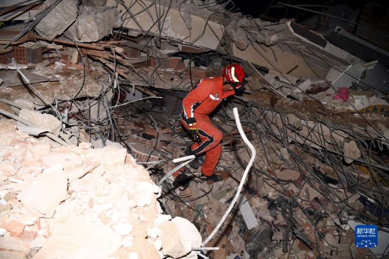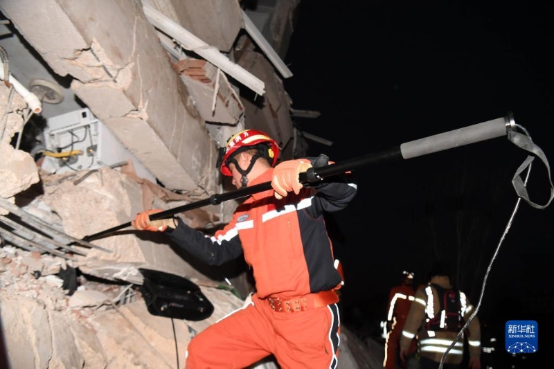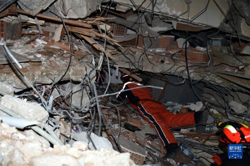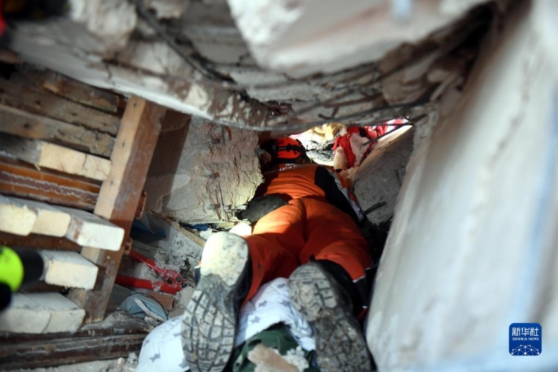 2月8日,中國救援隊(duì)隊(duì)員在土耳其哈塔伊的一處地震廢墟搜救。