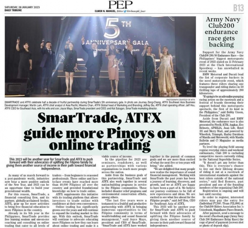 疫情散去,春暖花開,一切的美好都在向我們招手。隨著ATFX漂移團(tuán)隊(duì)首戰(zhàn)獲亞軍成功贏得開門紅后,面對(duì)2023年良好開局,知名金融科技經(jīng)紀(jì)商ATFX旗下各地辦事處積極應(yīng)對(duì)新年新挑戰(zhàn),謀劃制定一系列市場營銷方案。繼1月泰國辦事處召開新年會(huì)議后,ATFX菲律賓團(tuán)隊(duì)緊跟泰國團(tuán)隊(duì)步伐,開展多場主題內(nèi)容豐富的品牌市場營銷活動(dòng)。這一系列舉措得到了當(dāng)?shù)刂襟wDaily Tribune的關(guān)注,并在其報(bào)紙醒目的位置上報(bào)道了品牌在新年中的市場活動(dòng),引發(fā)市場高度關(guān)注。
