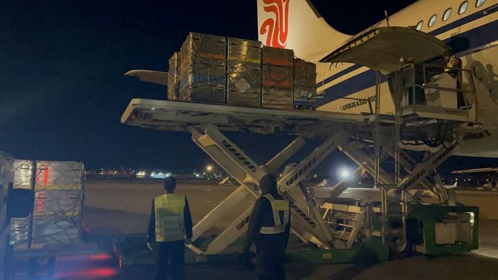 ↑2月8日,中國(guó)救援隊(duì)抵達(dá)土耳其阿達(dá)納機(jī)場(chǎng)卸運(yùn)物資(手機(jī)拍攝)。