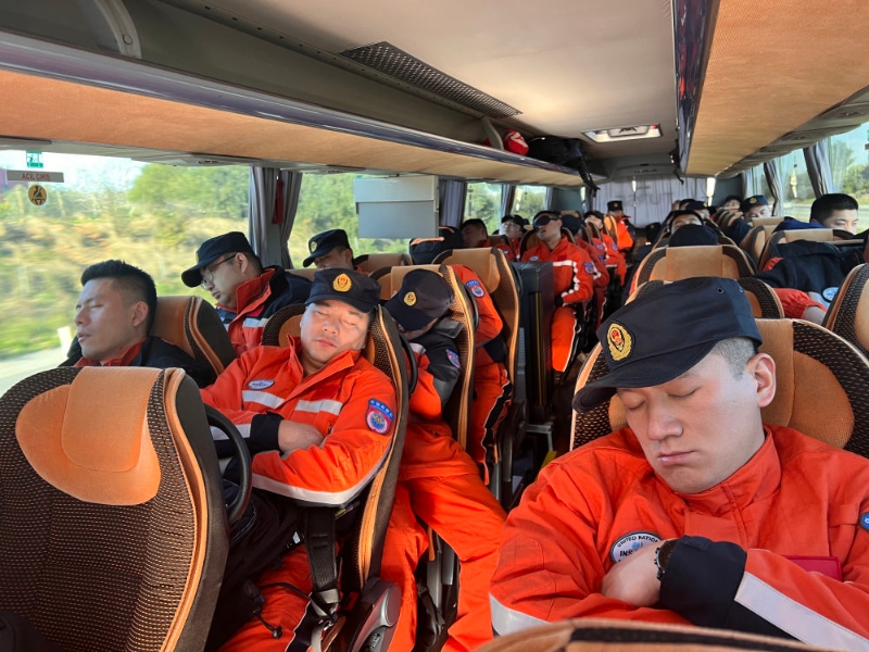 ↑2月8日,中國(guó)救援隊(duì)集體搭乘長(zhǎng)途大巴奔赴地震重災(zāi)區(qū)哈塔伊省參加救援行動(dòng)(手機(jī)拍攝)。大巴上的時(shí)間是救援隊(duì)員短暫的休息機(jī)會(huì)。