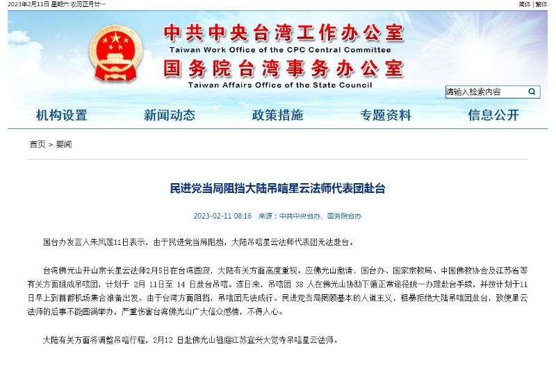 中新網(wǎng)2月11日電 據(jù)國(guó)臺(tái)辦網(wǎng)站消息,國(guó)臺(tái)辦發(fā)言人朱鳳蓮11日表示,由于民進(jìn)黨當(dāng)局阻擋,大陸吊唁星云法師代表團(tuán)無(wú)法赴臺(tái)?! ?/p>