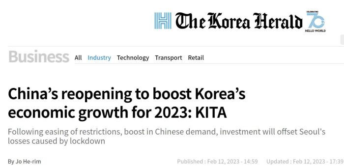 韓媒援引韓國貿(mào)易協(xié)會(huì)(KITA)國際貿(mào)易通商研究院12日發(fā)行的《中國經(jīng)濟(jì)重啟對(duì)韓國經(jīng)濟(jì)影響分析報(bào)告》指出,中國經(jīng)濟(jì)若從2023年第二季度起全面反彈,對(duì)華依存度較高的韓國經(jīng)濟(jì)和出口形勢有望好轉(zhuǎn)。