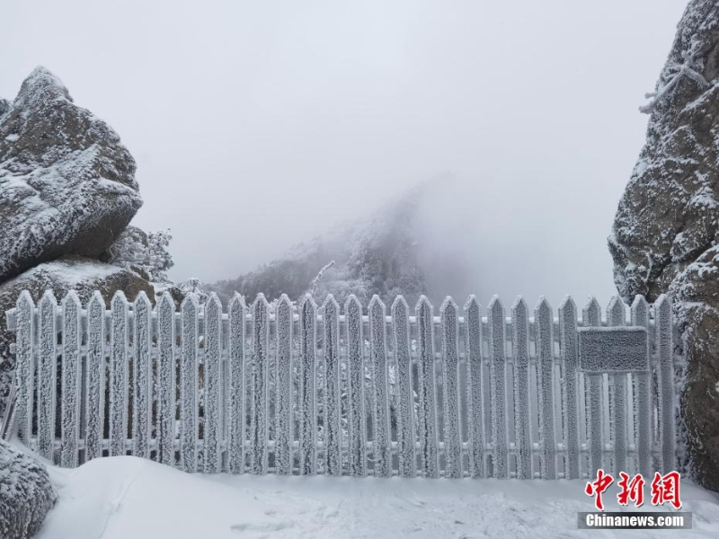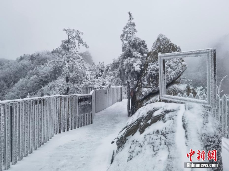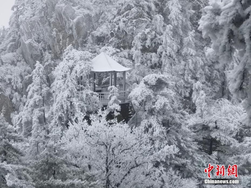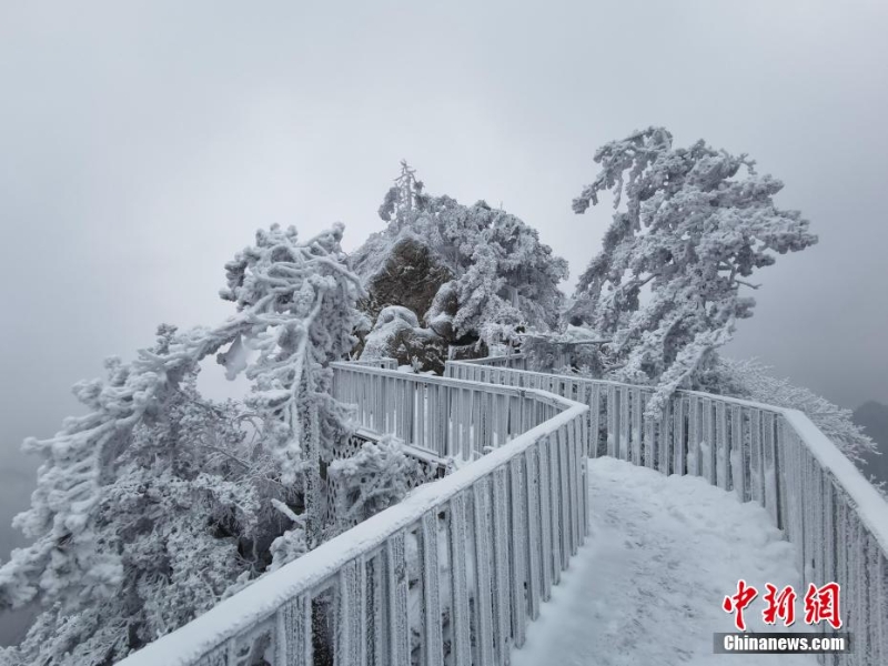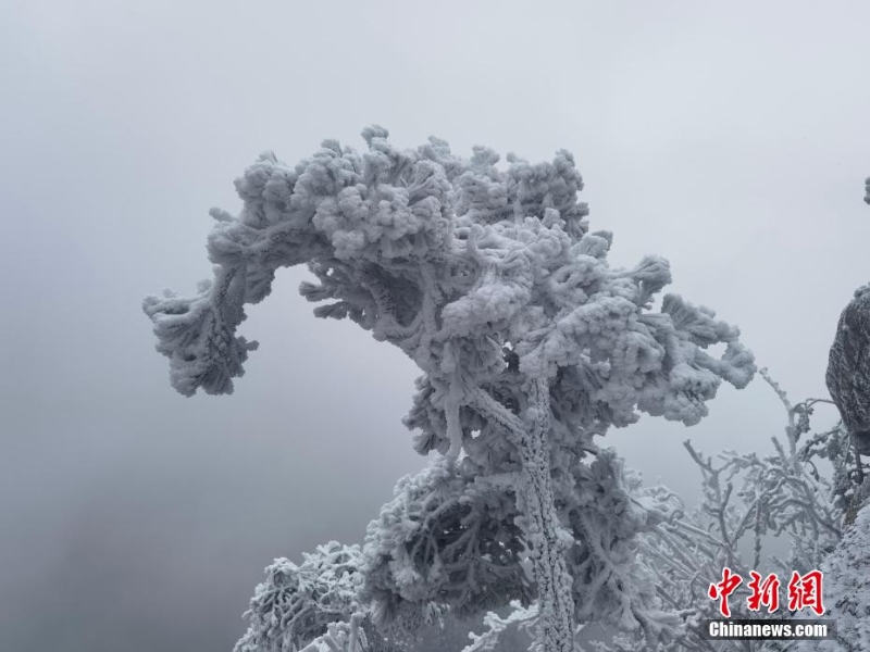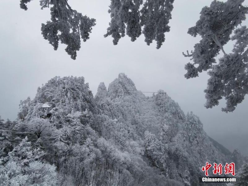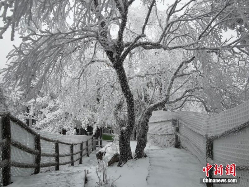 2月13日,河南南陽(yáng)老界嶺出現(xiàn)大面積霧凇自然景觀。放眼望去,潔白晶瑩的霜花掛滿枝頭,玉樹瓊枝,美景如畫。圖為老界嶺霧凇景觀。