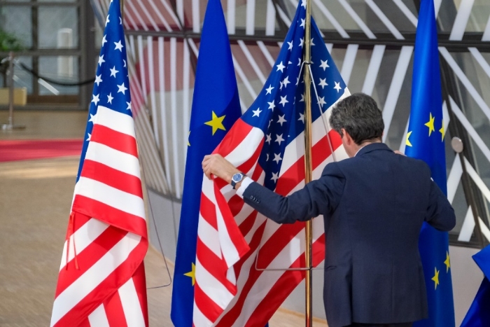 2022年3月24日,工作人員在比利時布魯塞爾的歐盟總部整理美國國旗。新華社記者張鋮攝