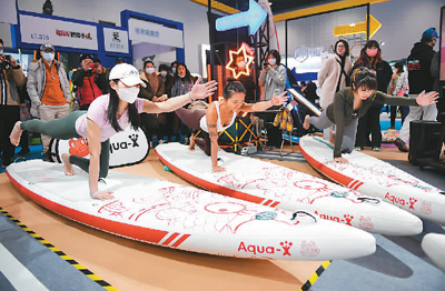 日前,2023亞洲運(yùn)動(dòng)用品與時(shí)尚展在國家會(huì)議中心舉行。國內(nèi)外220家展商、360余個(gè)品牌集體亮相,展覽面積達(dá)3萬平方米,涵蓋滑雪、騎行等豐富的戶外運(yùn)動(dòng)項(xiàng)目。圖為參觀者在展會(huì)上體驗(yàn)槳板瑜伽。新華社記者 張晨霖?cái)z
