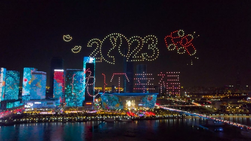 參演無人機(jī)最多的一次在重慶。除夕夜,3000架無人機(jī)在當(dāng)?shù)氐牡貥?biāo)朝天門表演了15分鐘,一幅幅形象生動、色彩豐富的“畫面”在夜空中鋪展,吸引了眾多觀眾。