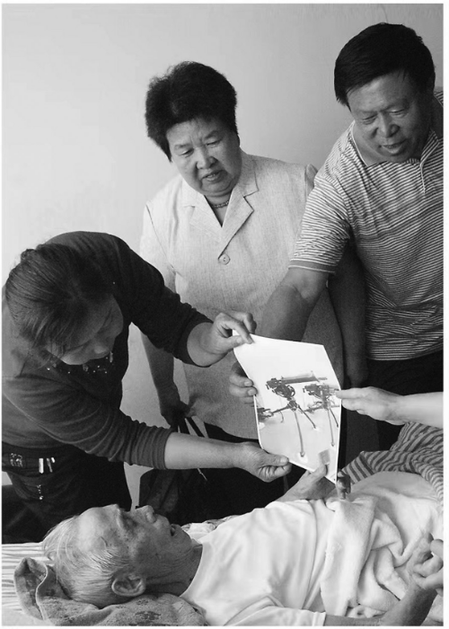 孫艷華(右二)和志愿者向老兵鄒懷清展示他當年繳獲的機槍照片。受訪者供圖