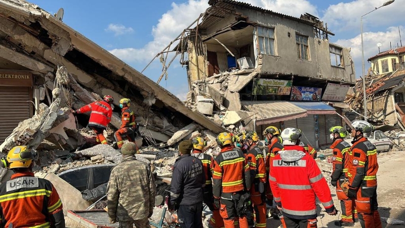 2月11日,特區(qū)救援隊在哈塔伊市的一個街區(qū)進行搜救工作。